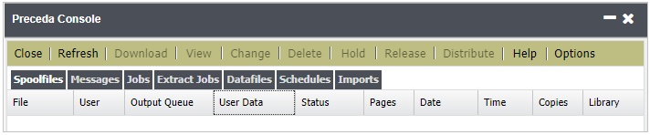 Preceda Console has been designed to manage and work with jobs and spool files on the server. The viewing of spool files is available only if you have Preceda Presenter installed and you have been granted access by your System Administrator.