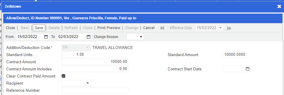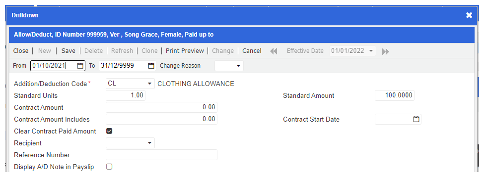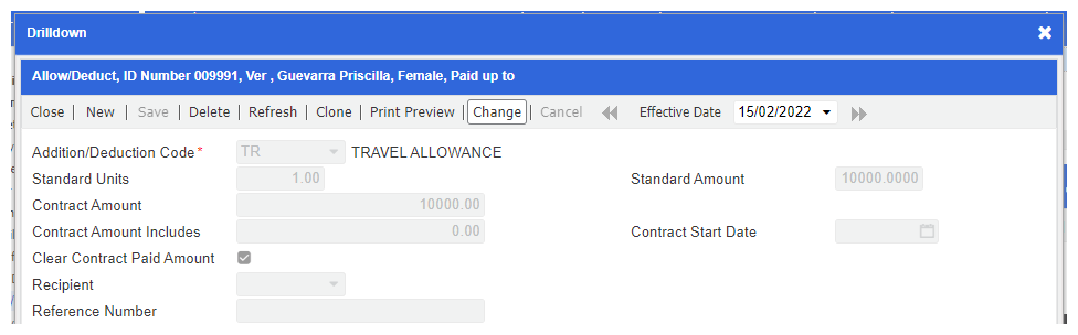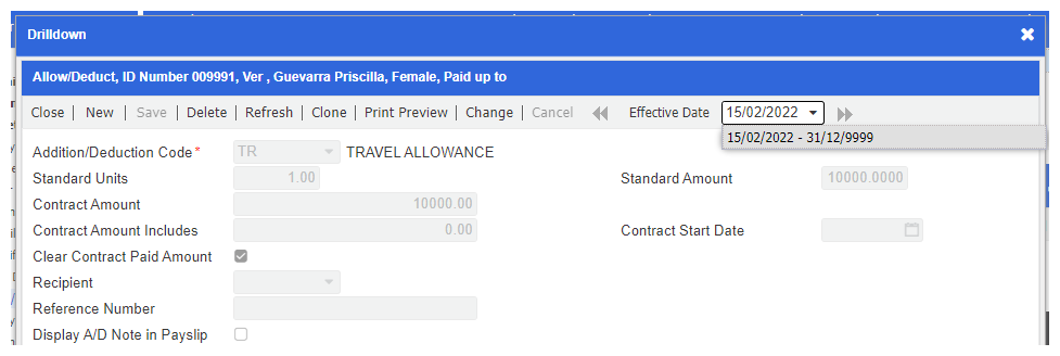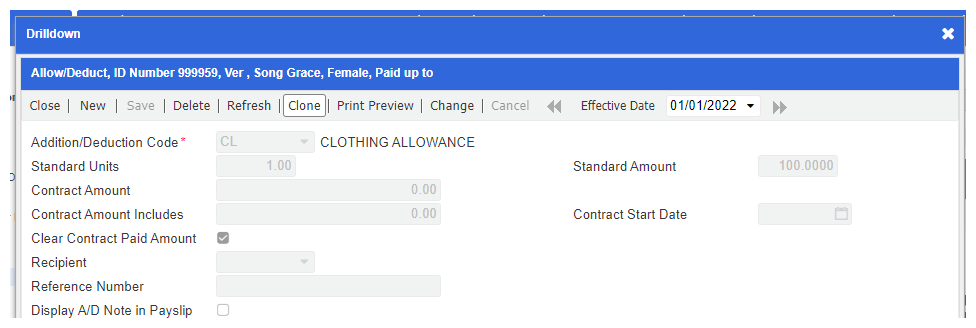 This window is used to view and maintain the details of an employee's Allowances/Deductions.