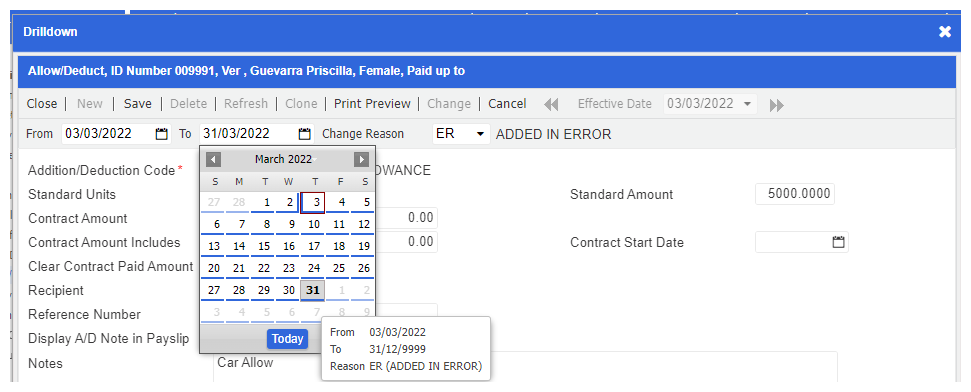 - The default 'Allowance Rate' value from the Allow/Deduct Code is displayed when you hover on the Information icon on the Allow/Deduct screen. This value is based on the 'As At' date in the Date Picker.
