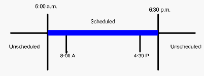 Any punch from 7:00 am to 9:00 am would be associated with the rostered in punch for the day, for grace periods, scheduled rounding and exception reporting processes. Any punch between 6:00 am and 7:00 am would not be associated with the rostered in punch and would appear as an unscheduled punch. |