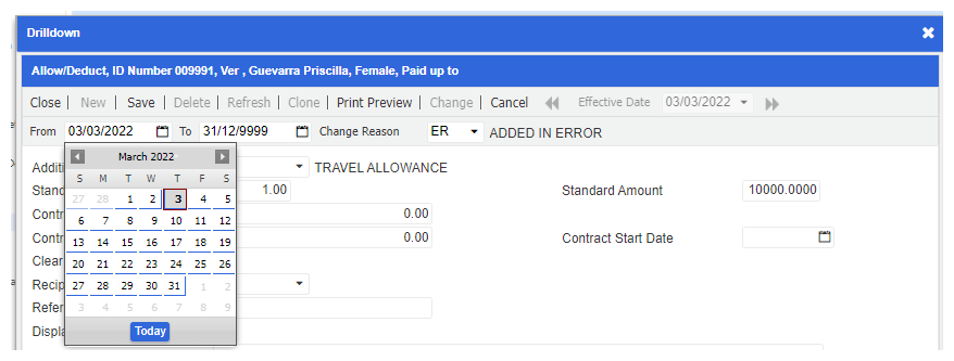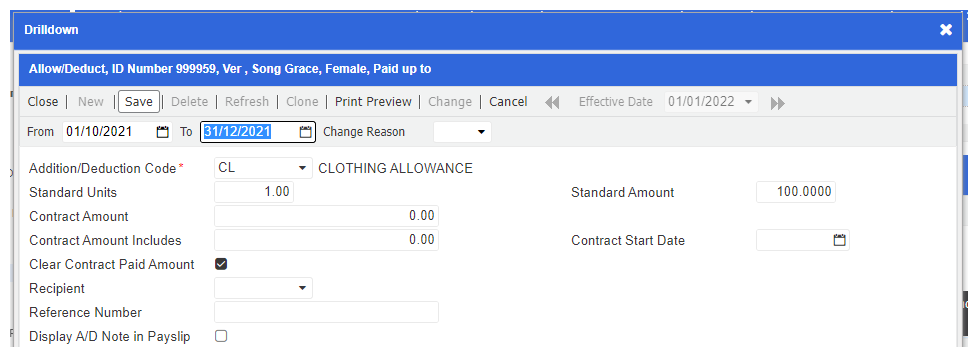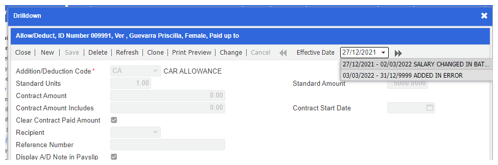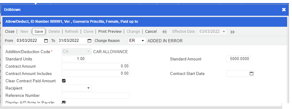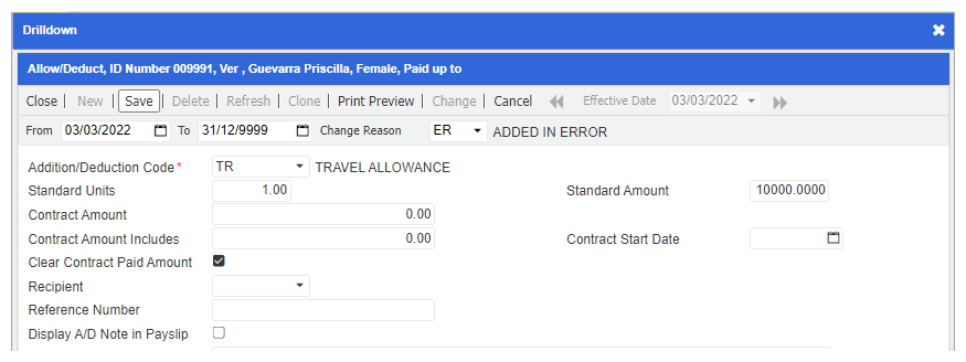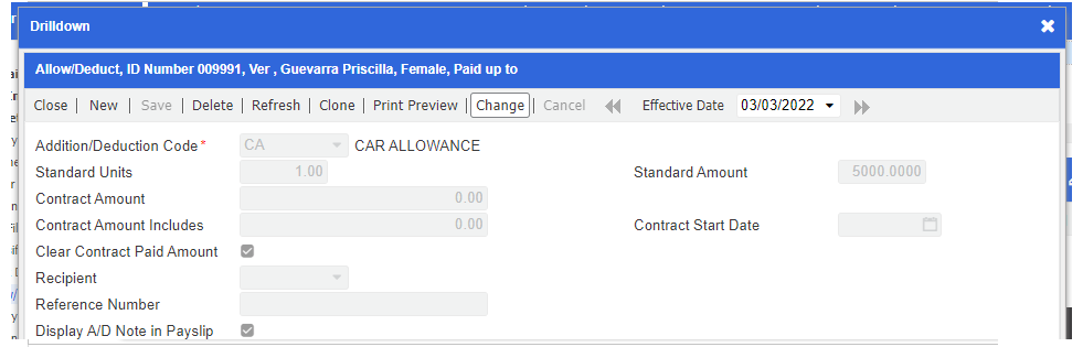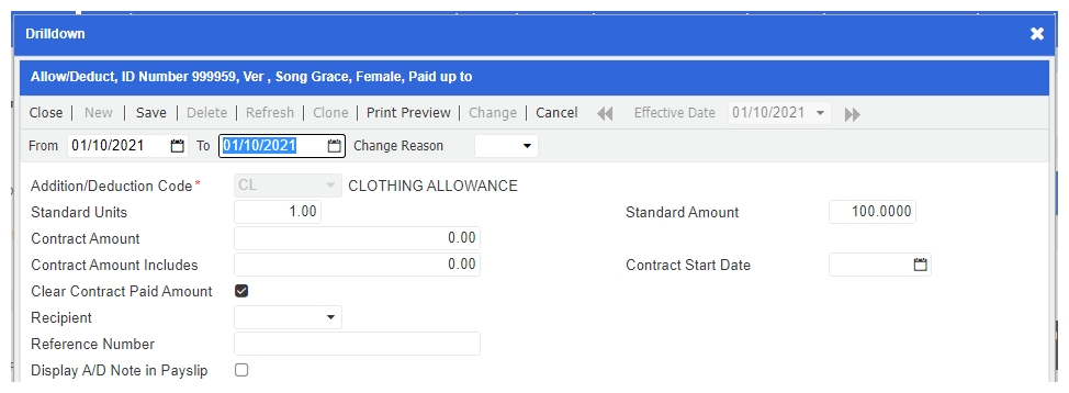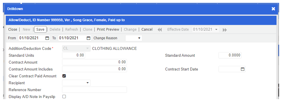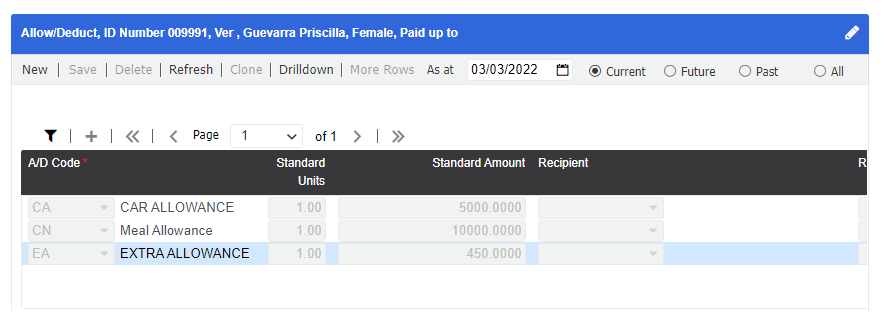 This window is used to view and maintain the details of an employee's Allowances/Deductions.