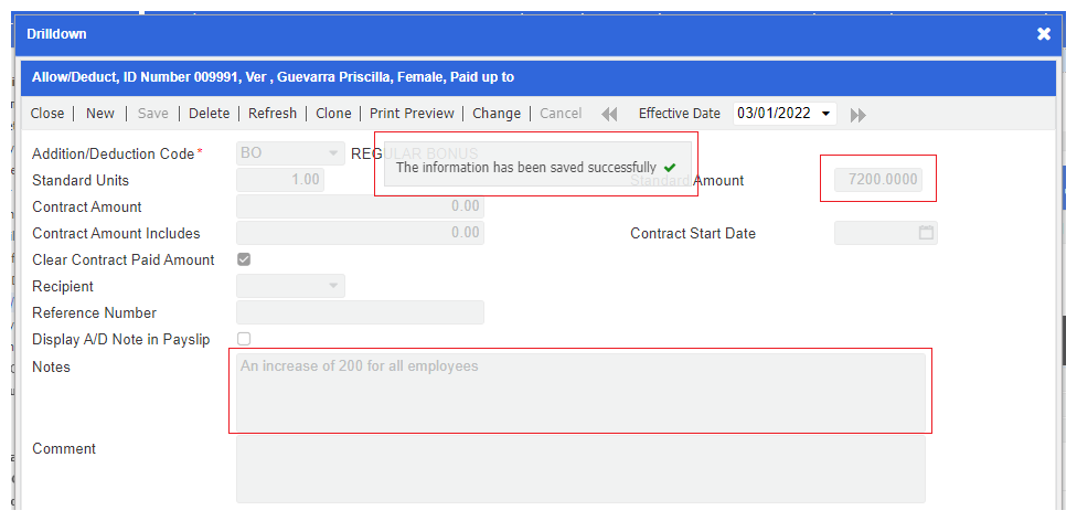 Once successful, you will be prompted with the message below, and the new Standard Amount value and Notes are now visible (in read-only mode).