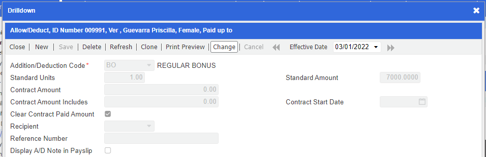- This field is displayed only when in View-Only Mode or Change Mode. Upon using the New or Clone functionality, even if the record is to become effective over the current period of time, the Contract Paid Amount will not be displayed.