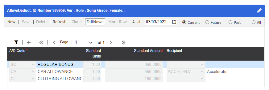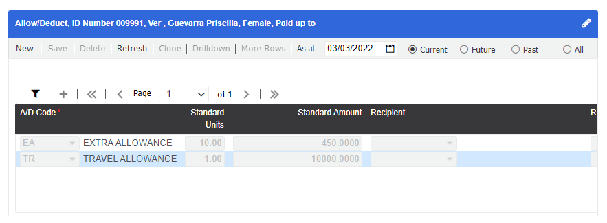 - The information displayed on this screen corresponds to what is current for each of the existing A/D Codes for the employee as at today's date. A/D Codes that do not have effective records on the current date are not displayed.