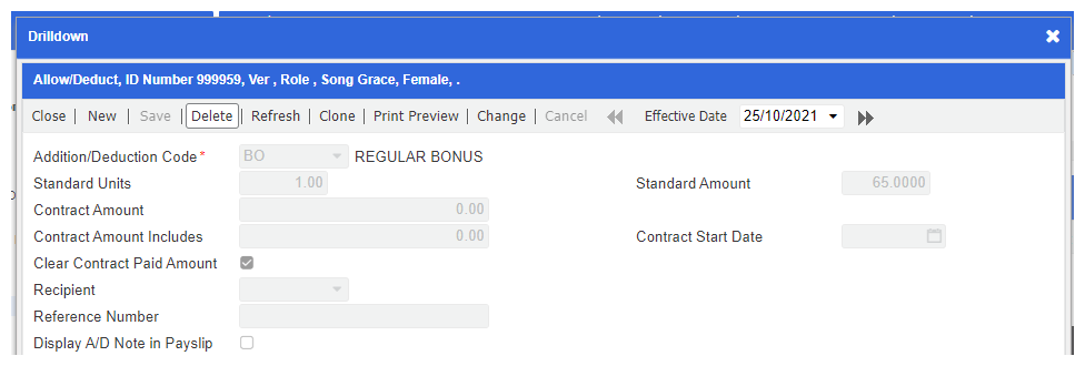 This button allows you to delete an Allowance/Deduction record. This is only enabled if the record you are looking at has a From date after the employee's Paid Up To date.