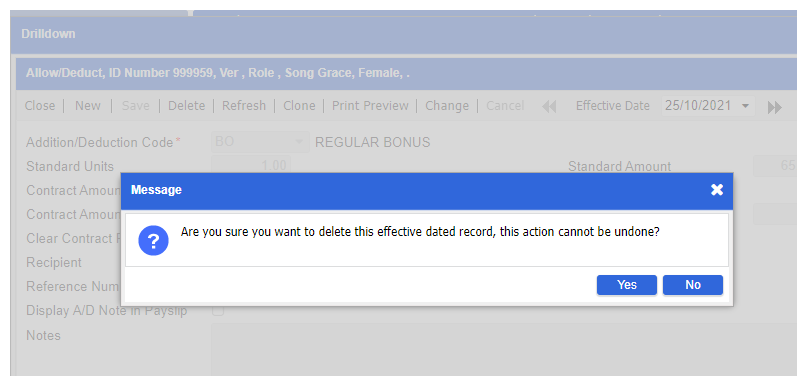 In deleting a record, the other effective dated records will not be affected. Nonetheless, there will still be a message asking for confirmation prior to deleting the record.