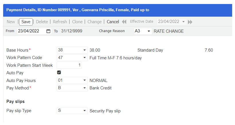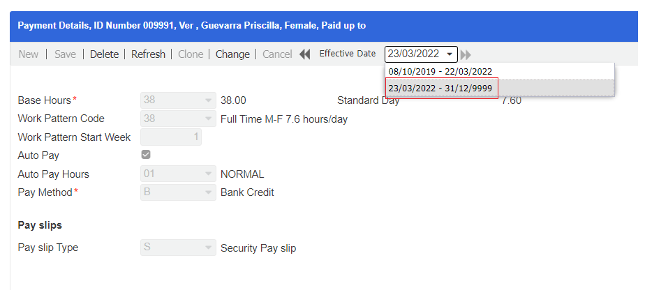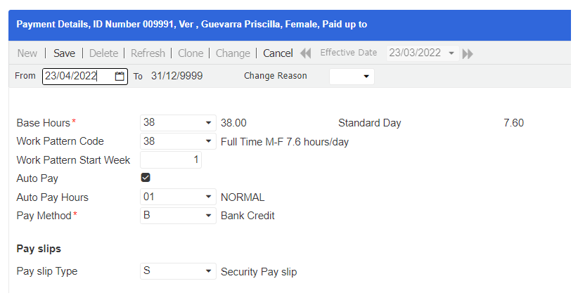 - Click Change, and create a new record with the From date that is '22/04/2022 + 1' or '23/04/2022'. The To date will automatically be set to infinity since this now becomes the latest record of the employee.