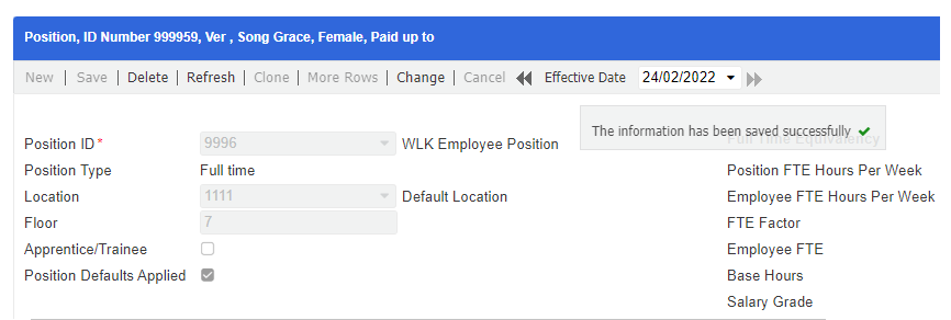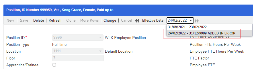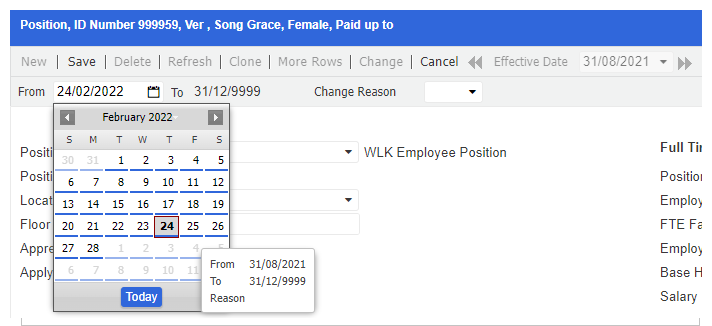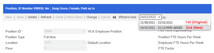 *Since the new record being created is the 2nd Position record for the employee (i.e. the first being the record from Hire Date), the To date of this new record is set to infinity; while the To date of the original record is now 'new record From date - 1' or '23/02/2022'.
