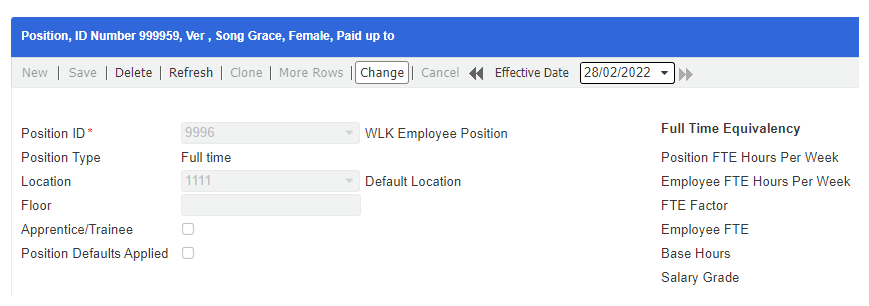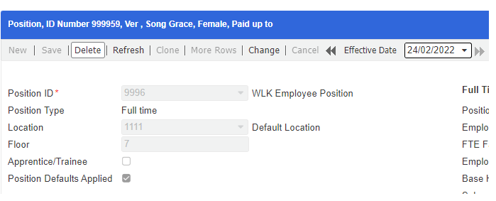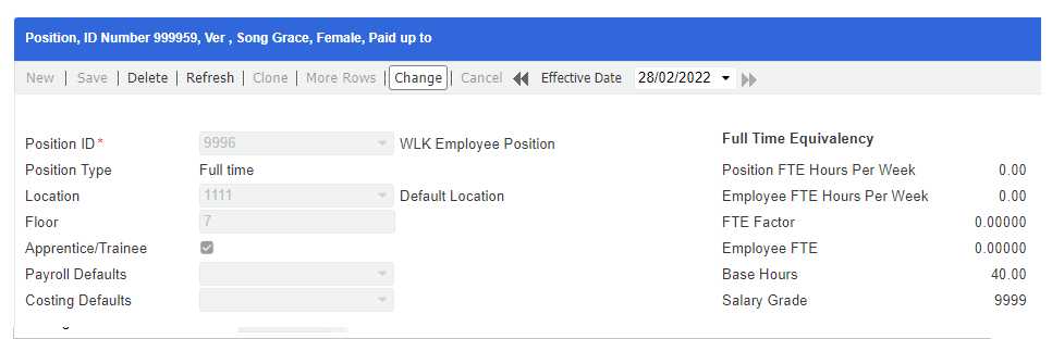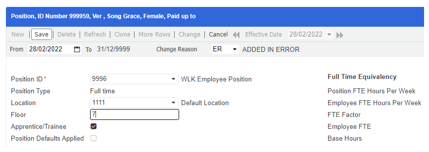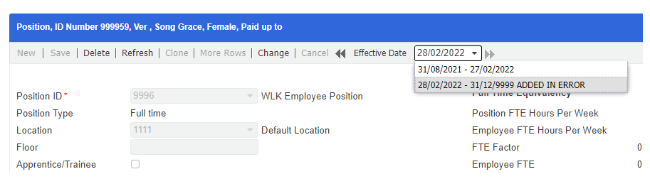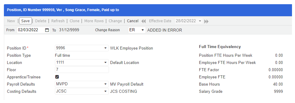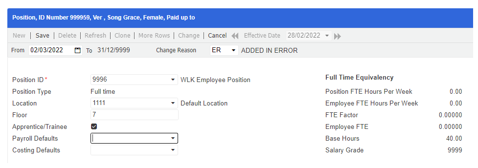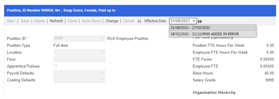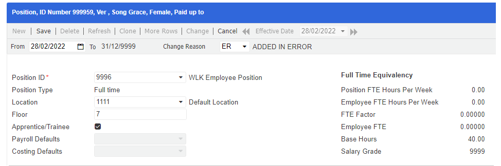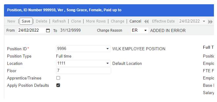 - You can only update the Position and Costing Defaults if you are creating a new record (i.e. a record is considered new if the From date or Position ID has been changed).