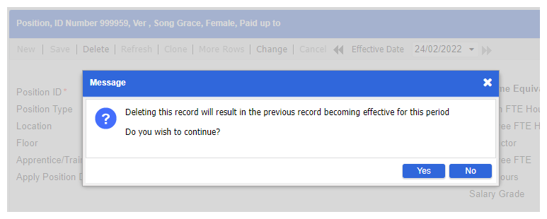- Reply Yes to the warning message about previous record becoming effective on this period. Note that once you click Yes and the record has been deleted, the action cannot be undone.