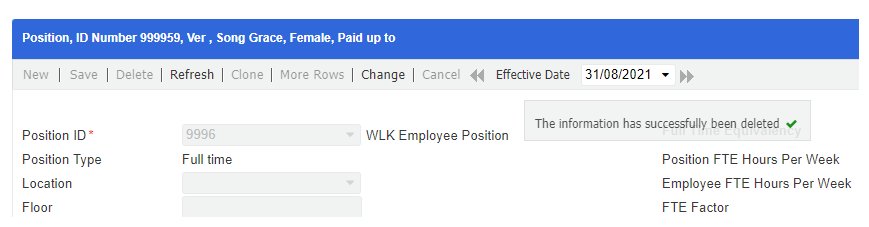 - Upon deleting a Position record, the record before the one that was deleted will extend over the period time of the deleted record. However, deleting a Position record will not modify any data related to Payroll or Costing defaults applied as a result of moving the employee to the position being deleted. The user should perform manual adjustments on the affected screens, if required. Note that it will not be possible to delete the Position record that corresponds to the employee's Hire Date or is the first one on the set in an Active employee record.