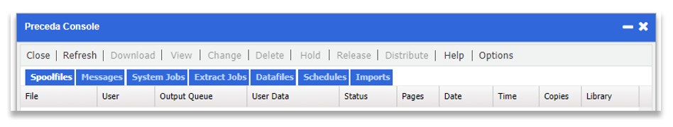 Preceda Console has been designed to manage and work with jobs and spool files on the server. The viewing of spool files is available only if you have Preceda Presenter installed and you have been granted access by your System Administrator.
