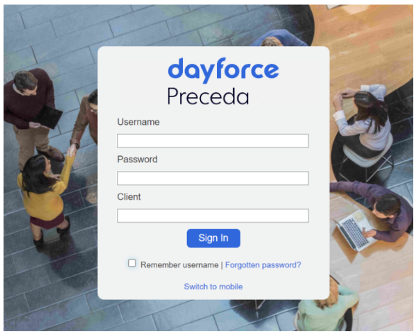 1. On Preceda Log In page, enter your login credentials (i.e. Username, Password, Client).
