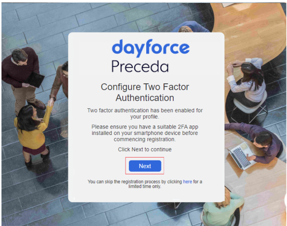 You can only skip the 2FA Enrolment if you are in the Transition Period. If you have already been notified that 2FA has been enabled in Preceda and the Transition Period has not yet been completed, you will see something like this after your credentials are validated: