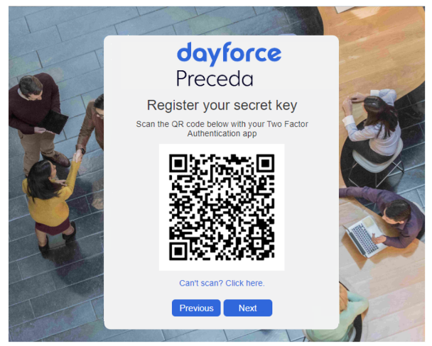 Click the option "Can't scan? Click here" in case your camera does not work or you're attempting to log in via Preceda Mobile. A secret key will then be displayed in plain text. Copy this key to your 2FA Application, and click Next.