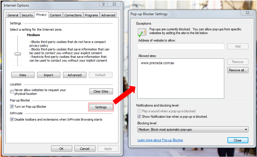 2. From the Privacy tab, click on Settings of the Pop-up Blocker section. Enter "www.preceda.com.au" and press the Add button.